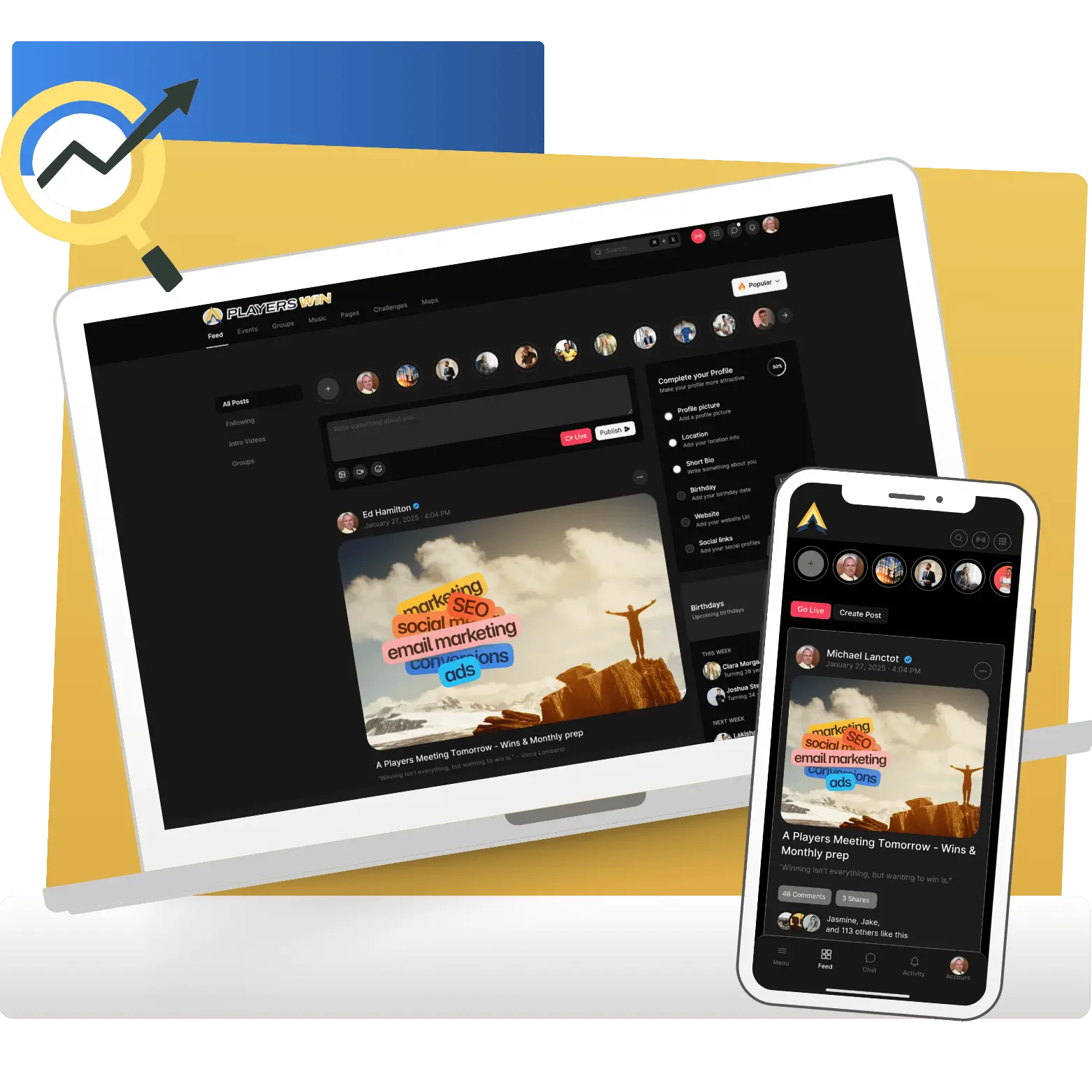 You get monthly access to the A-Players Win Community, Weekly Coaching & Mentoring Calls, The Private Mobile & Desktop Platform Network, Access to Monthly Fly-Ins, Access to Coaching Call Recordings, Access To Business Networking Experiences of A-Players Win Network, and more.